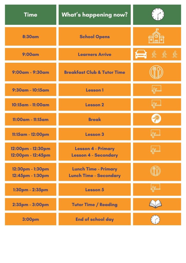 Structured lessons begin at 9.30 am and end at 2:45pm. At the end of their lessons, learners take part in ‘tutor time’ and then leave school at 3.00pm for their transport home.